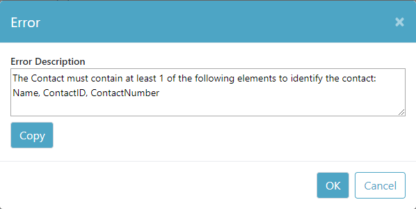 The full error you will get is "The Contact must contain at least 1 of the following elements to identify the contact: Name, ContactID, ContactNumber".